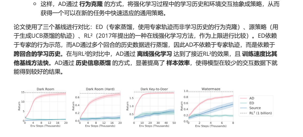 - 传统RL需要于环境交互,AD在于多个回合的历史进行蒸馏,通过行为克隆将跨回合的学习历史转化为一个神经网络模型。可直接根据过去历史做到更好的决策,而不用每次进行完全的强化学习训练